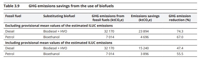 Според табелата од Извештајот намалувањето на пресметаните стакленички гасови при замена на фосилните горива со соодветни биогорива е 70 проценти доколку се исклучи индиректниот ефект од производството на биогоривата, а 50 проценти доколку се вклучи и ефектот на стакленички гасови од одгледувањето на растителните култури од кои се добива биогоривото.