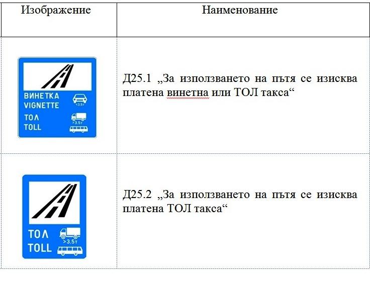 Со нови сообраќајни знаци ќе се сигнализираат и учесниците во сообраќајната мрежѓа за која е потребно да се има платена вињетка или патарина. Знакот Д25.1 ќе ги информира возачите дека за користењето на патот е потребна платена вињетка или патарина, додека знакот Д25.2 ќе биде само за патарина. Тие ќе се постават на местото од каде што почнува обврската за плаќање.