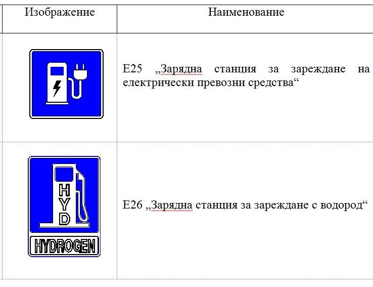 Предвидени се и специјални знаци кои укажуваат на присуство на станици за полнење на електричните возила и станици за полнење на автомобилите со водород.