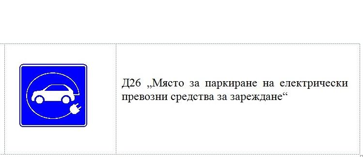 Воведен е и посебен патоказ за паркирње на електрични возила за полнење – Д26. Меѓу утврдените симболи се додава и симболот „Електрично возило“.