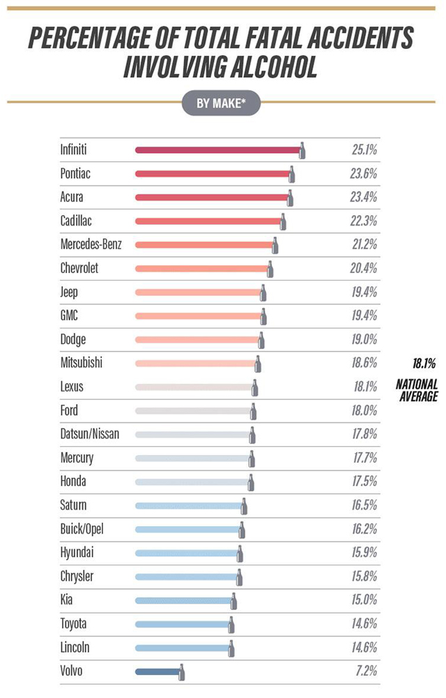 Составувачите на овој рејтинг ги одредуваат и трите најчести причини за смртоносни сообраќајни несреќи, а тие се: зголемена брзина, алкохол и наркотици. Најопаснисе покажале возачите на Infiniti, кои причинуваат тешки сообраќајки, со оглед на тоа што секоја трета несреќа поради зголемена брзина е со автомобил од овој бренд.