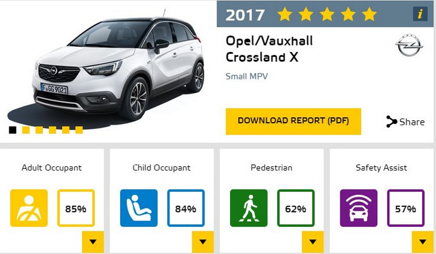 Во најновото оценување за безбедност објавено од EuroNCAP кросоверот на Opel од B-сегментот, Crossland X доби максимални пет ѕвезди. Резултатот се базира на најдобрите оценки во пет категории: заштита на возрасни патници, децата и пешаците, како и за помошни системи. Crossland X се претстави особено добро во тестовите на страничен удар во бариера, во кои доби максималните поени за заштита на возрасните патници и децата.