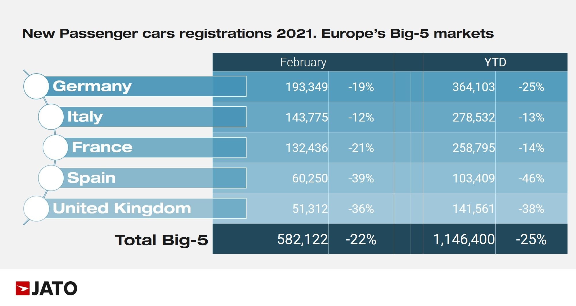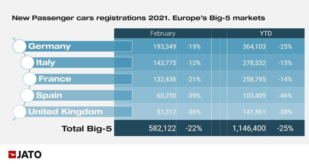 Најголем пад во продажбата е забележан во Шпанија каде во февруари е забележана за 39 отсто помала продажба, а на годишно ниво за 46 отсто. Сега втор најголем пазар во Европа е Италија каде се продадени 143.775 возила, и има најмал пад (само 12 отсто) во февруари 2021 и на годишно ниво тој пад е само 13 отсто.