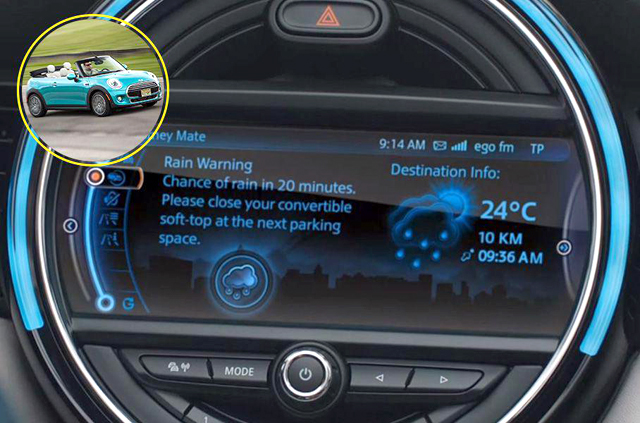 Патувањето со кабриолет може да биде уништено само од дожд. Во MINI го решиле овој проблем со системот за предупредување за врнежи според планираната маршрута. „Личниот метеоролог“ може да се порача само со определен тип на навигација.