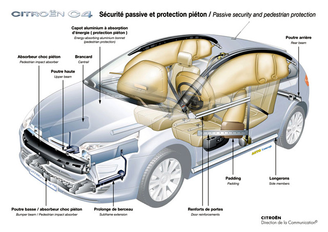 7.Неподвижниот дел на воланот од прват генерација на Citroen C4 од 2004 година им овозможува на инженерите поголема слобода во изборот на форма на еирбег. Како резултат на тоа францускиот хечбек се здобива со првото воздушно перниче со контури на превртено јајце, кое подобро ја чува глават, рамениот поја и градниот кош на возачот.