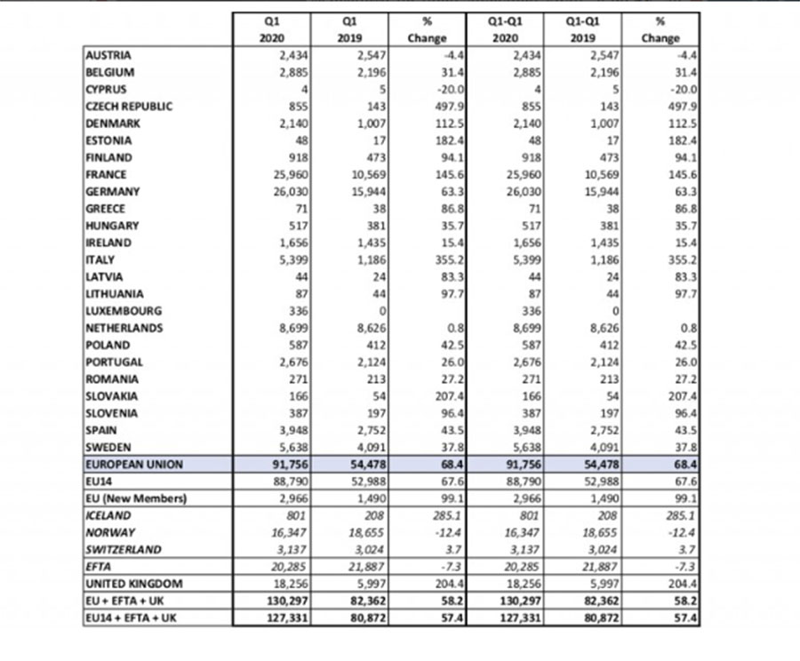 Најимпресивно за првите три месеци на 2020 година е зголемувњето во побарувачката на елосно електричните автомобили во Чешка, каде што е забележан раст од 500% (+497.9%) до ниво од 855 примероци. Зголемување од 355,2% (до 5.399 примероци) се забележува во Италија, од 285,1% на Исланд, од 207% во Словачка, од 204.4% во Велика Британија и од 145,6% во Франција.
