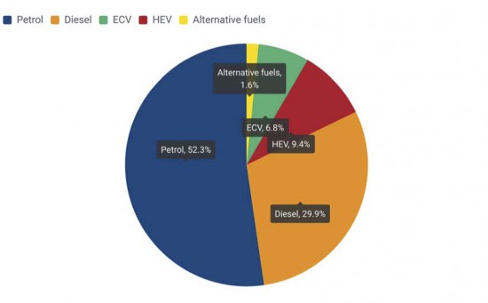 Податоците на ACEA покажуваат дека во првата четвртина од 2020 година, доминирачка позиција на европскиот пазар имаа бензинците. И покрај намалувањето на новите регистрации од 32,2% до ниво од 1,3 милиони единици тие држат 52,3% од вкупниот бизнис. Големо е и намалувањето во побарувачката на нови дизел автомобили со 32,6% до 738.392 примероци, што е еднакво на пазарниот удел од 29,9% (33,2% за првата четвртина на 2019 година).