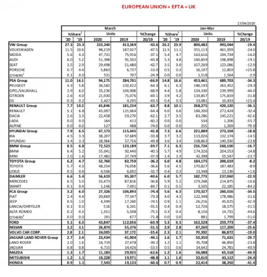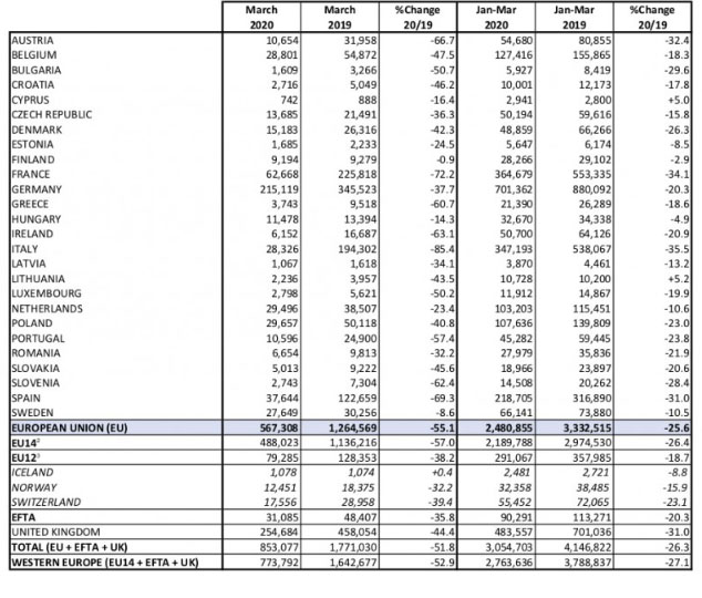 Последните податоци кои се објавени од страна на Асоцијацијата на автомобилски производители во Европа (АСЕА) покажуваат дека регистрациите што биле направени на новите патнички автомобили во Европа во март имаат пад од 55,1% до ниво од 567.308 возила (1.264.569 во март во 2019 година, но и со податоци за Велика Британија).