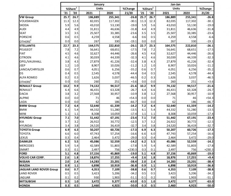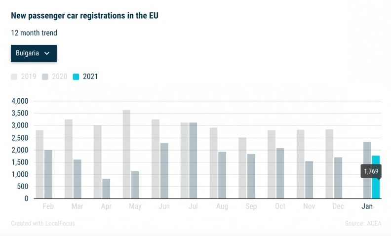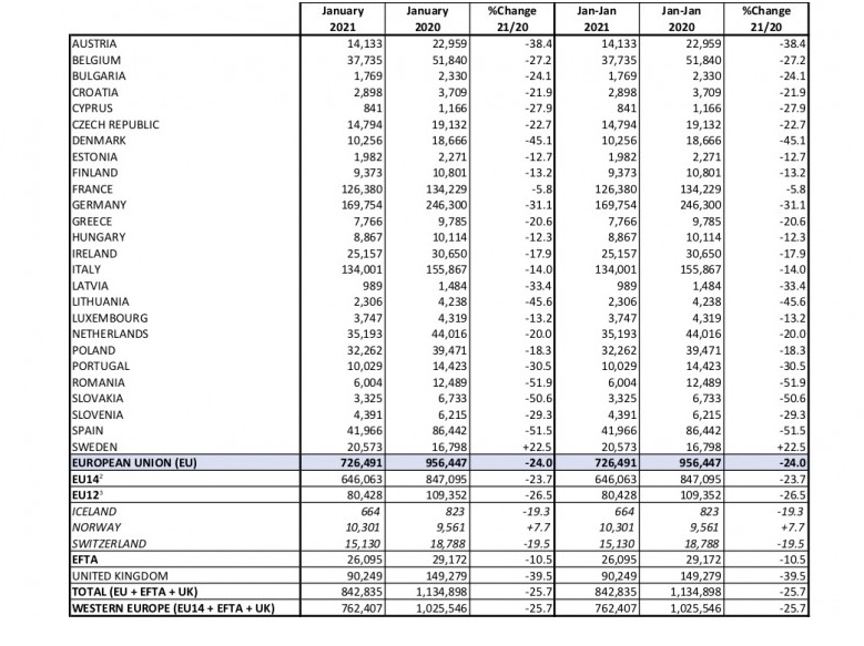 Последните податоци објавени од страна на Асоцијацијата на автомобилски производители во Европа  (ACEA) покажуваат дека регистрациите на нови автомобили во јануари достигнале ниво од 726.491 единици, што е за 24% помалку во споредба со јануари во 2020 година.