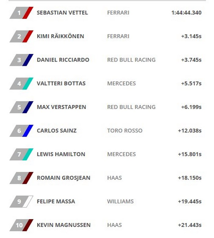 На подиумот во Монте Карло покрај победникот Себастијан Фетел беа уште и Кими Раиконен од Ferrari и Даниел Рикардо од Red Bull. За Ferrari ова е 90. „еден-два“ победа во Формула 1