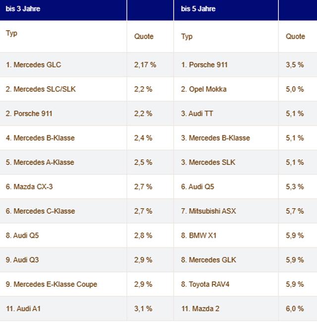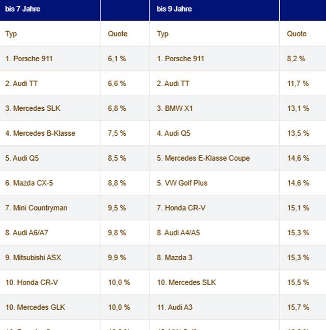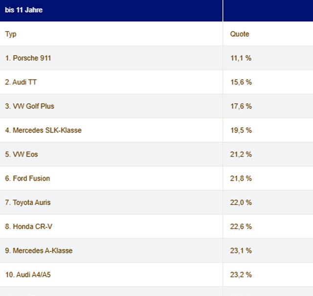 Германските експерти направиле рангирање на брендовите и моделите кои се во прашање, така што ги разделиле автомобилите во пет возрасни категории. Тоа се автомобили до три години, до пет години, до седум години, до девет години и до 11 години. Освен кај најновите, каде што шампион е Mеrсеdеs GLС, Pоrsсhе 911 e лидeр во сите други рангирања.