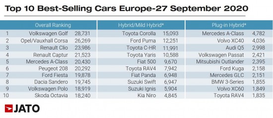 Најбараниот модел на европскиот пазар за септември е Volkswagen Golf со 28.731 единици, а во ТОП 5 исто така влегуваат и Opel/Vauxhall Corsa (26.269), Renault Clio (23.986), Renault Captur (21.523) и Mercedes A-Class (20.430).