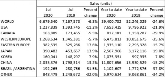 Продажбите на нови автомобили во јули на глобално ниво достигнаа бројка од 6.679.540 единици, што е за 6,8% помалку во споредба со истиот месец во 2019 година. Податоците на LMC Automotive покажуваат дека побарувачката на нови патнички автомобили во првите седум месеци од годината е 39.400.732 единици, што е за 24,6% помалку во споредба со истиот период минатата година.