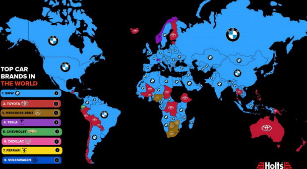 Од мапата прикажана во продолжение од прва може да се види доминацијата на BMW на сите континенти. Германскиот бренд е најпребаруван во дури 137 држави во светот, а вистинска доминација има во Европа каде само во четири земји (Исланд, Норвешка, Финска и Швајцарија) тој не е најпребаруван бренд.