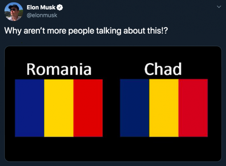 Тој објави твит од фотографија на која се наоѓаат знамињата на Романија и Чад. При тоа на истата напиша “Зошто луѓето повеќе не зборат за ова?” алудирајќи на идентичноста на знамињата.