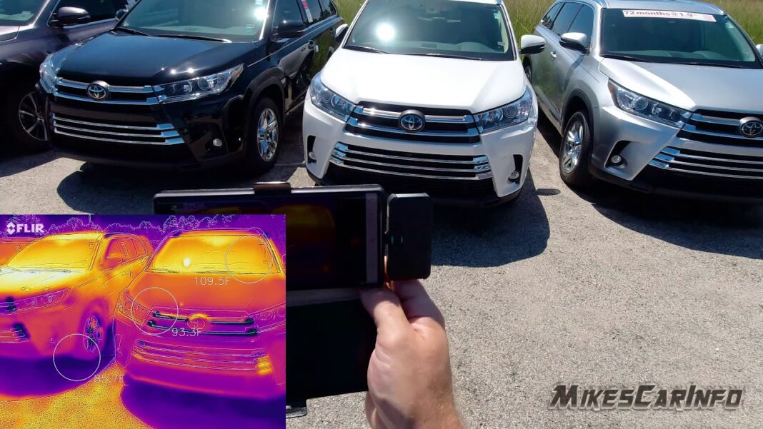 Од видеото може да се види дека автомобилот Toyota Highlander со црна боја има температура од 70,5 степени Целзиусови, додека белиот 45 што претставува разлика од цели 25,5 степени Целзиусови.