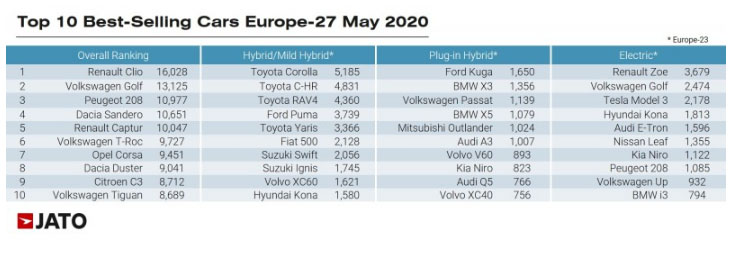 Во зависност од тоа која агенција ги објавува резултатите, од кои пазари се истите и кои параметри се користат, понекогаш има и различни резултати за тоа кое возило е најпродавано. Во позадина на исклучително сложената економска состојба (-57%), актуелната верзија на Renalt Clio зазема позиција на најпродаваниот нов автомобил во Европа во мај.