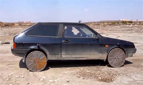 Целта на новосибирските ентузијасти овој пат беше да се провери дали решетките за отпадна вода можат да ги заменат тркалата на автомобилите, Ќетирите капаци од леано желесо со тежина од 25 килограми се продупчени и прицврстени за ВАЗ-2108 како обични бандажи.