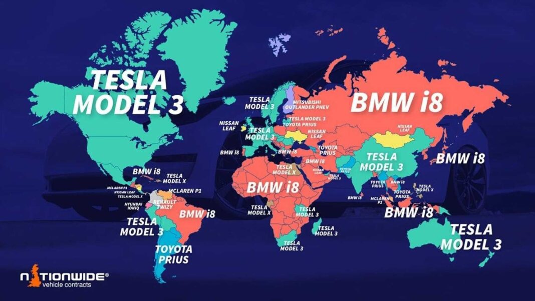 Nationwide врз основа на податоците на Google создаде мапа на најпребарувани електрични возила во секоја земја.