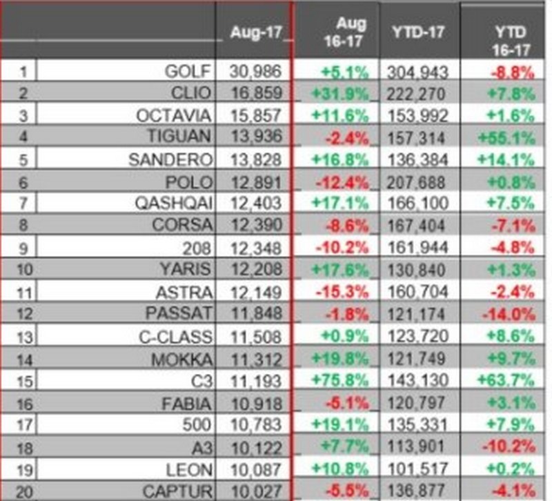 На второ место со раст од речиси 32% до 16.859 единици во август се наоѓа Renault Clio, а на трето место е Skoda Octavia (+ 11,6%). Во првата петорка влегуваат уште Volkswagen Tiguan (-2.4%, 13 936) и Dacia Sandero (+ 16,8%, 13 828).