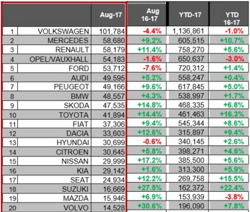 Последните податоци на Агенцијата JATO Dynamics која се занимава со истражување на пазарот на нови автомобили покажуваат дека во август 2017 во Европа биле продадени 899.272 нови автомобили, што претставува зголемување од 5,4% во споредба со август 2016. Убедливо најмногу продава Volkswagen, единствен што има шестцифрена бројка, односно 101.784 возила.