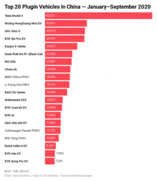 Кон крајот на првите девет месеци на 2020 година, најпопуларниот од кинеските корисници на електричното возило на полнење е Tesla Model 3 со 82.321 реализирани единици, а во Топ 5 влегуваат Wuling HongGuang Mini EV (32.041), GAC Aion S (30.515), BYD Qin Pro EV (30.301) и Baojun E-Series (24.637).