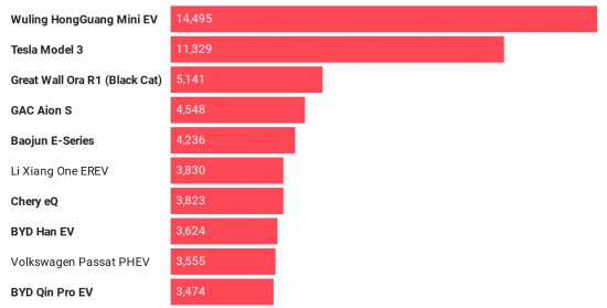 Во Топ 5 на најпопуларните возила во земјата исто така влегуваат и Tesla Model 3 (11.329), Great Wall Ora R1 (5.141), GAC Aion S (4.548) и Baojun E-Series (4.236).