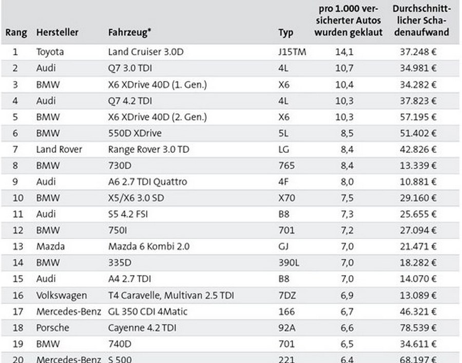 Здружението на германски осигурителни компании, GDV, објави листа на автомобили кои се најчеста мета на крадците ширум Германија. Интересно е да се напомене дека премиум моделите на премиум брендовите доминираат на оваа табела, а посебно се популарни SUV моделите.