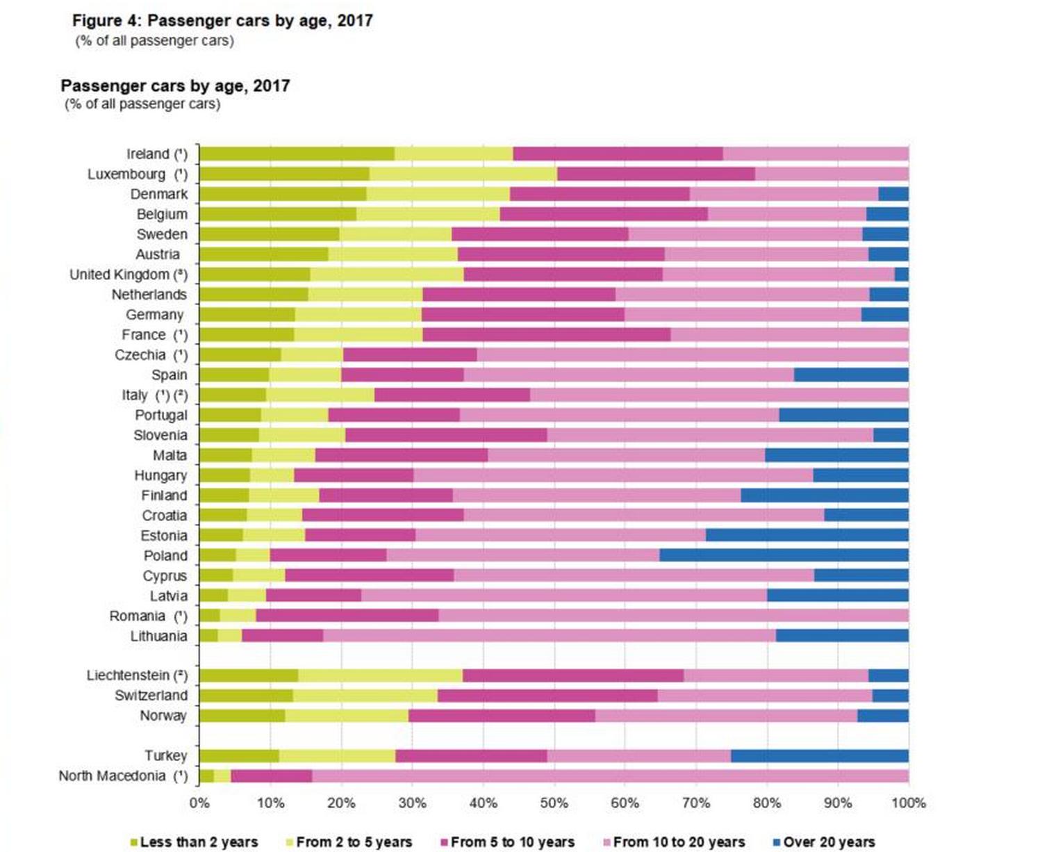 Но, не сме тука најлоши бидејќи во Полска овој процент е највисок, односно 35,2 отсто од возилата се постари од 20 години, слично како и во Естонија (28,7) и Финска (23,7 отсо)