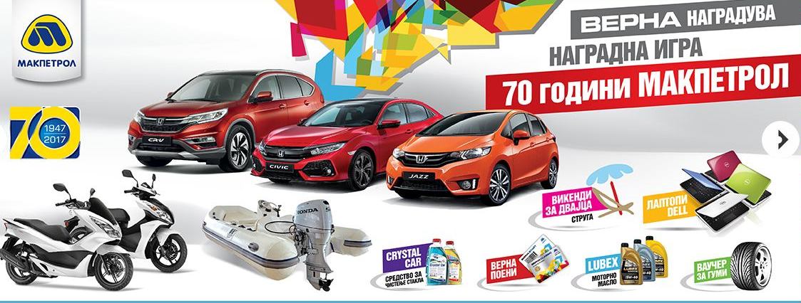 Во период кога компанијата слави 70 години од постоењето за своите лојални корисници Макпетрол организира наградна игра вредна 100.000 евра во која ќе бидат доделени 2 скутера Honda, веспа Honda, чамец со приколка и вонбродски мотор Honda, Honda Jazz, Honda Civic и Honda CRV.