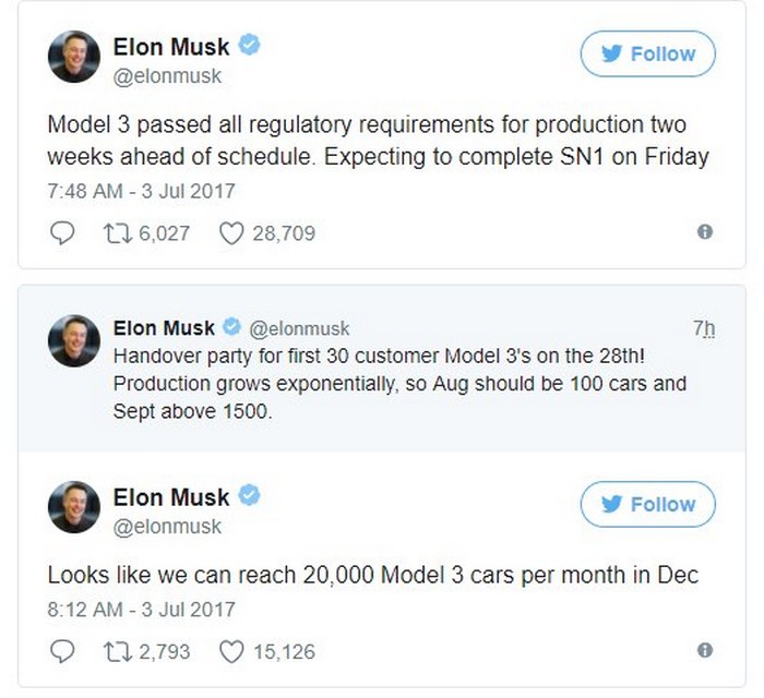 Сопственикот на Tesla, Елон Муск преку твитер објави дека првите 30 возила од Tesla Model 3 ќе им бидат испорачани на сопствениците на 28 јули на посебна церемонија. Така го одржа ветувањето дека навреме ќе го објави денот за долго очекуваниот Model 3 објавувајќи и некои детали плус.
