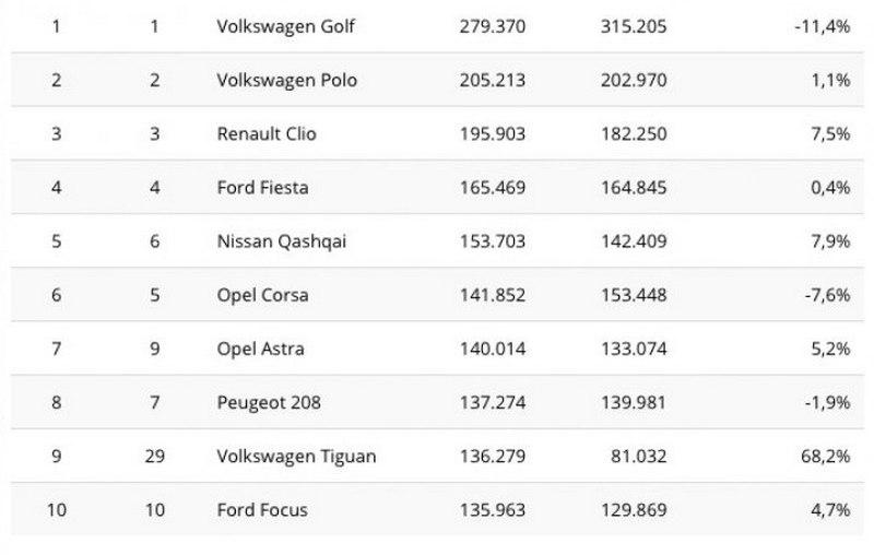 Во Топ-10 модели најголем скок има Volkswagen Tiguan кој има пораст од 68,2 отсто и од 29 место сега е на 9 место со 81.032 возила. Пад од едно место има Opel Corsa (-7,6 отсто) и сега е на 6. место со 153.448 продадени возила.