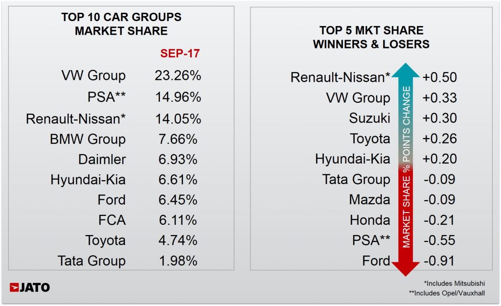 Кај автомобилските брендови на челната позиција е Volkswagen Group со пазарен удел од 23,26 %, по што доаѓаат PSA (со Opel/Vauxhall) со 14,96%, Renault-Nissan-Mitsubishi со 14,05%, BMW Group со 7,66%, Daimler со 6,93 %, Hyundai-Kia со 6,61%, Ford со 6,45%, FCA со 6,11%, Toyota со 4,74% и Tata Group со 1,98%.