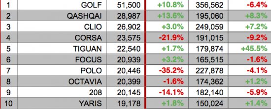 Најпродаван нов автомобил во Европа во септември е Volkswagen Golf (со пораст од + 10,8% односно 51.500 возила). На второ место со раст од 13,6% односно 28.987 единици се наоѓа Nissan Qashqai, а на трето е Renault Clio (26.902, + 3%).