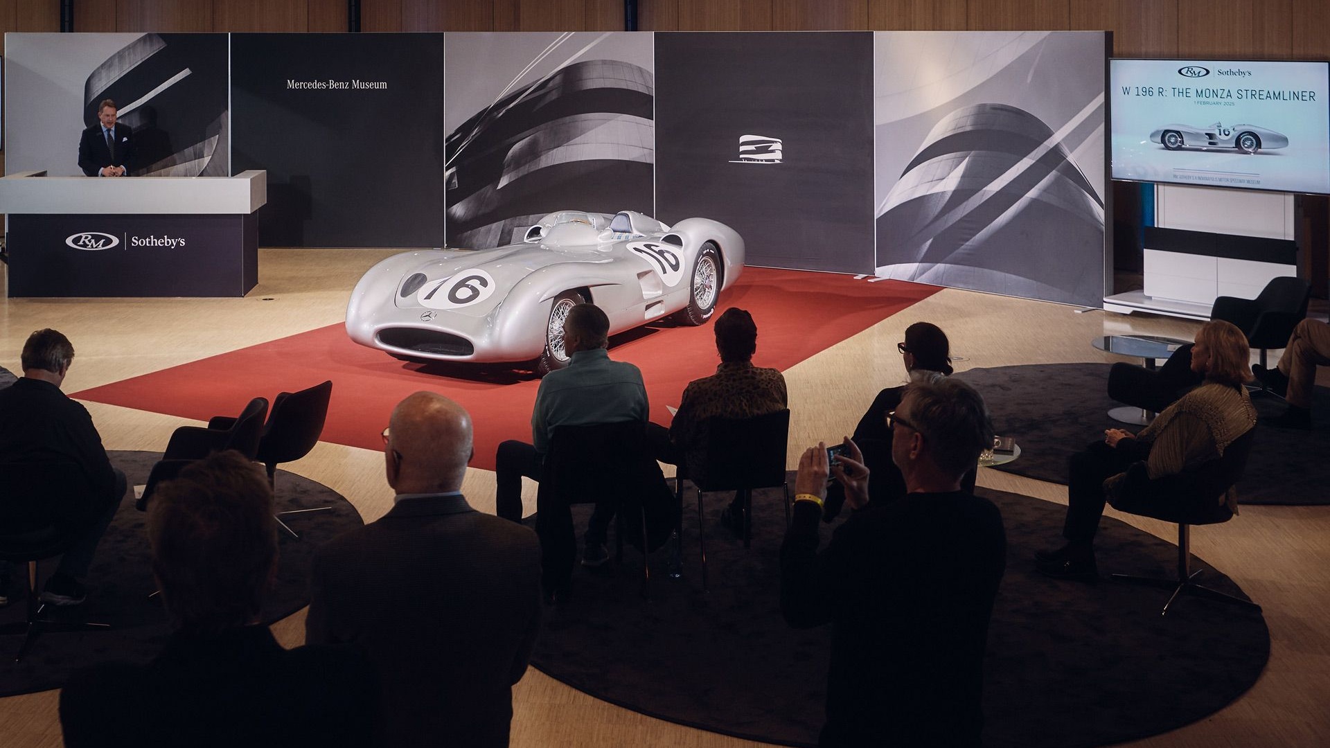 Mercedes W 196 R го привлече интересот на колекционерите на автомобили од целиот свет и беше предмет на жестока војна на наддавање, и на лице место и преку телефон, пред аукционерот за последен пат да го удри чеканот.