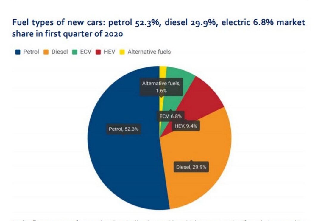 Во првиот квартал од 2020 година возилата што се движат на струја доживееа скок во продажбата во својот сегмент во Европа и тие се 6,8 отсто од вкупната продажта (спредено со 2,5 отсто лани). Во исто време е забележано намалување на вкупната продажба поради пандемијата со коронавирусот. Опаѓа побарувачката за возила со погон на бензин и дизел, но бензинците се уште доминираат и тоа во повеќе од половина земји во ЕУ.