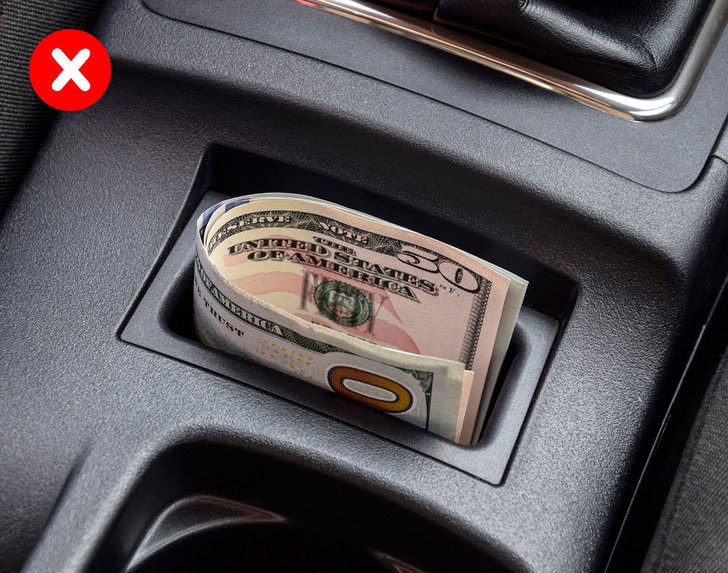 Многу луѓе сакаат да чуваат пари на тајно место во случај на вонредна ситуација. Сепак, ако тие се оставени на видливо место тогаш тоа е практично покана за крадците да ги земат. Ако, сепак, чувате пари во автомобилот, тогаш ставете ги на место кое тешко се гледа. Добри тајни места се пепелникот или ретровизорот.