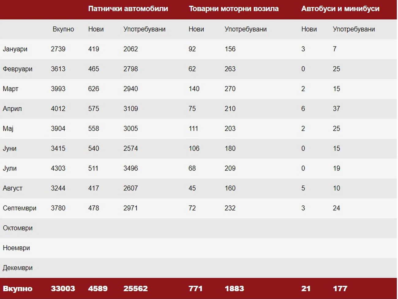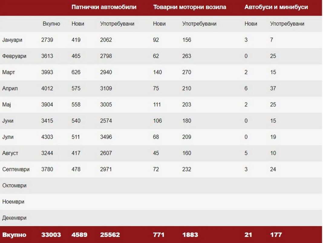 Во септември е забележан и пораст на увозот на нови автомобили при што се увезени 478 нови автомобили. Голем пораст е забележан и кај увозот на половни автомобили и тоа за 364 автомобили повеќе од август годинава.