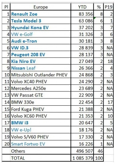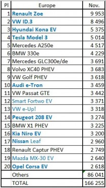 Податоците на ev-sales покажуваат дека во ноември, најбараниот електричен автомобил, особено 100% електричен, во Европа повторно е Renault ZOE со 9.953 продадени примероци. Во Топ 5 исто така влегуваа пионерскиот електромобил на Vоlkswagen ID.3 со 8.496 единици, Hyundai KONA EV со 5.375, Tesla Model 3 со 5.014 и хибридот Mercedes A250e со 4.517.