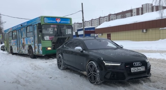 Автомобилот RS7 се обврзува за извлече автобус кој е заглавен во снег. После мало засилување и неколку секунди „боскувње“, големиот и моќен седан успева да го извади автобусот од ровот.