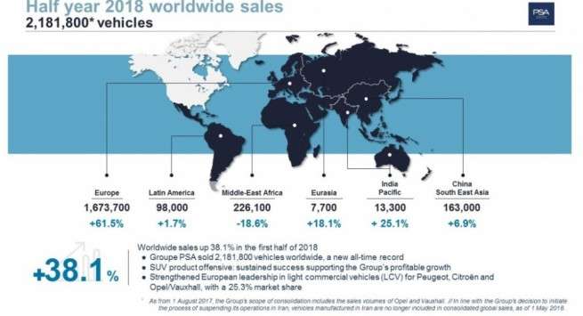 Групацијата PSA објави податоци дека во првите шест месеци од годината успеала да продаде 2.181.800 автомобили низ целиот свет. Ова е нов рекорд за групацијата и порад од 38,1% во однос на истиот период за 2017 година. Импресионира СУВ офанзивата на PSA Group со 13 модели, лансирани во целиот свет од петте брендаPeugeot, Citroën, DS Automobiles, Opel и Vauxhall. Од нив се продадени над 609.000 примероци од СУВ возилата, а тоа претставува 28 проценти од продажбите на целата група во споменатиот период.