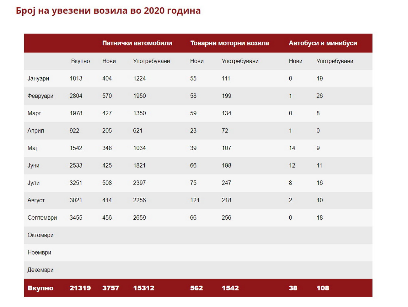 Вкупно до крајот на третиот квартал во 2020 година увезени се 3.757 нови и 15.312 половни автомобили односно 21.319 патнички автомобили, товарни моторни возила, автобуси и минибуси заедно.