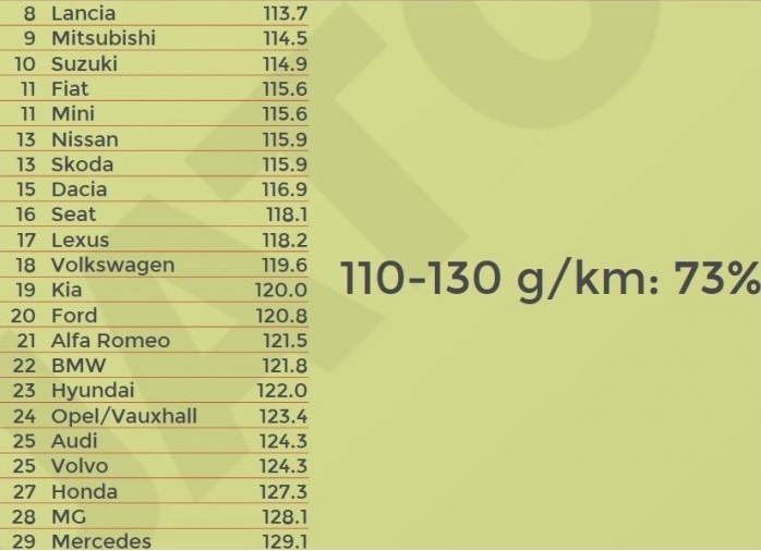Во најмасовната група реализацијата со 73 проценти од пазарот на нови возила во Европа влегуваат 22 марки, а со показатели од 130 до 160 грама CO2 на километар влегуваат уште осум марки.