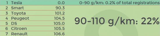 Без изненадување на врвот се најде производителот на автомобили од САД, Tesla со показател од 0 грама CO2 на километар.
