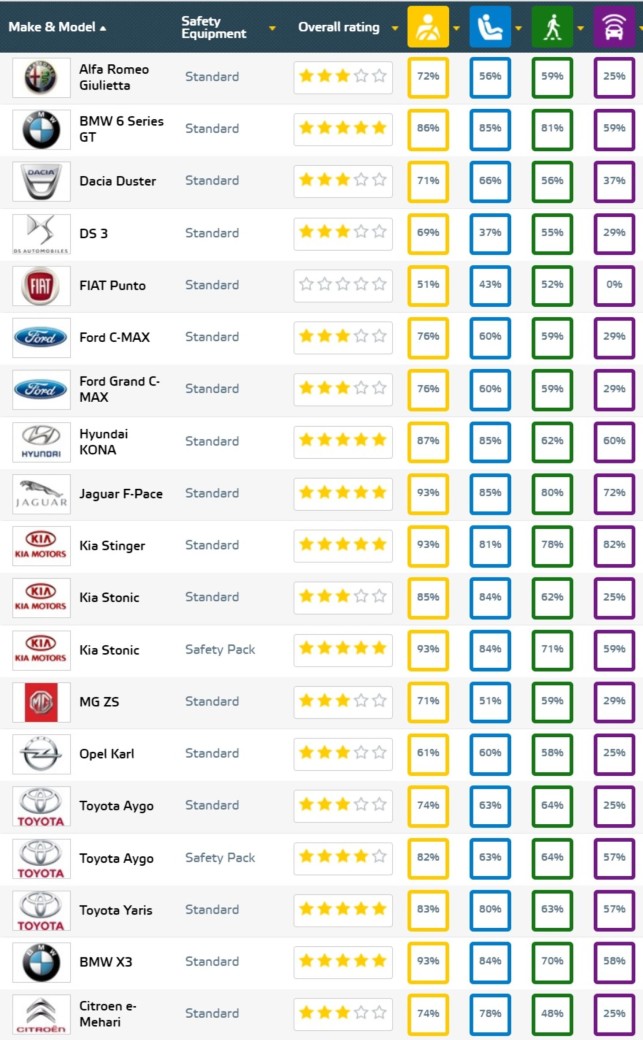Од постарите модели кои повторно се тестирани е и Alfa Romeo Giulietta која е на средина бидејќи доби три ѕвездички исто како и DS 3 и Ford C-Max/Grand C-Max.