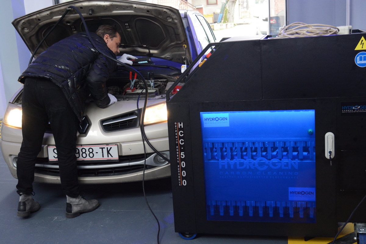 HHO гасот (водород и кислород гас) се добива со електрохемиска постапка на електролиза на дестилирана или деминерализирана вода. Целата технологија е спакувана во едан уред опремен со електроника која го следи целокупниот процес. Во зависност од зафатнината на моторот, точно е дефинирана количината на HHO гас која е потребна за квалитетен ефект на декарбонизација на моторот и делови на издувниот систем, во времетраење од 30 минути.
