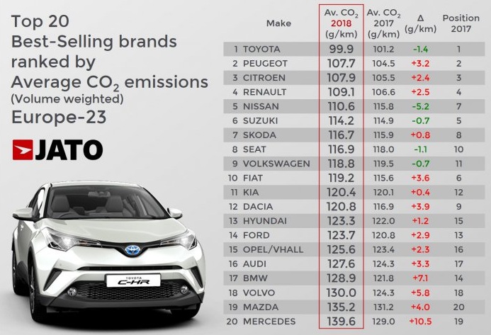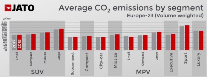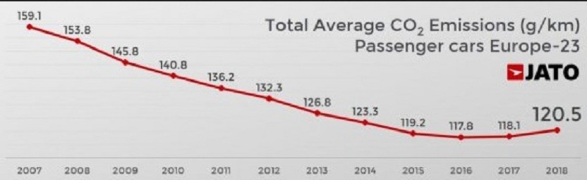 После падот од 18 проценти во побарувачката на нови дизел возила во минатата година во Европа, податоците на истражувањето на JATO Dynamics покажуваат дека во2018 година средниот показател на CO2 емисиите кај реализираните нови возила се има зголемено за 2,4 грама на километар и има достигнато ниво од 120,5 грама на километар после 119.2 за 2015 и 123.3 за 2014 година.