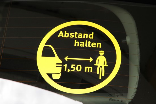 Заоблените налепници се со дијаметар од околу 20 сантиметри, имаат жолт фонт со илустрација и можат да бидат прикачени на задниот прозорец однадвор. Мотивот изразен на налепницта е „зачувајте го растојанието“ и ја нагласува минималната оддалеченост од 1,5 метар, кој треба да се примени при претекнување на велосипедистите во градот. Кога претекнувате деца или кога детето се превезува со мотор, тоа е дури и на два метри.