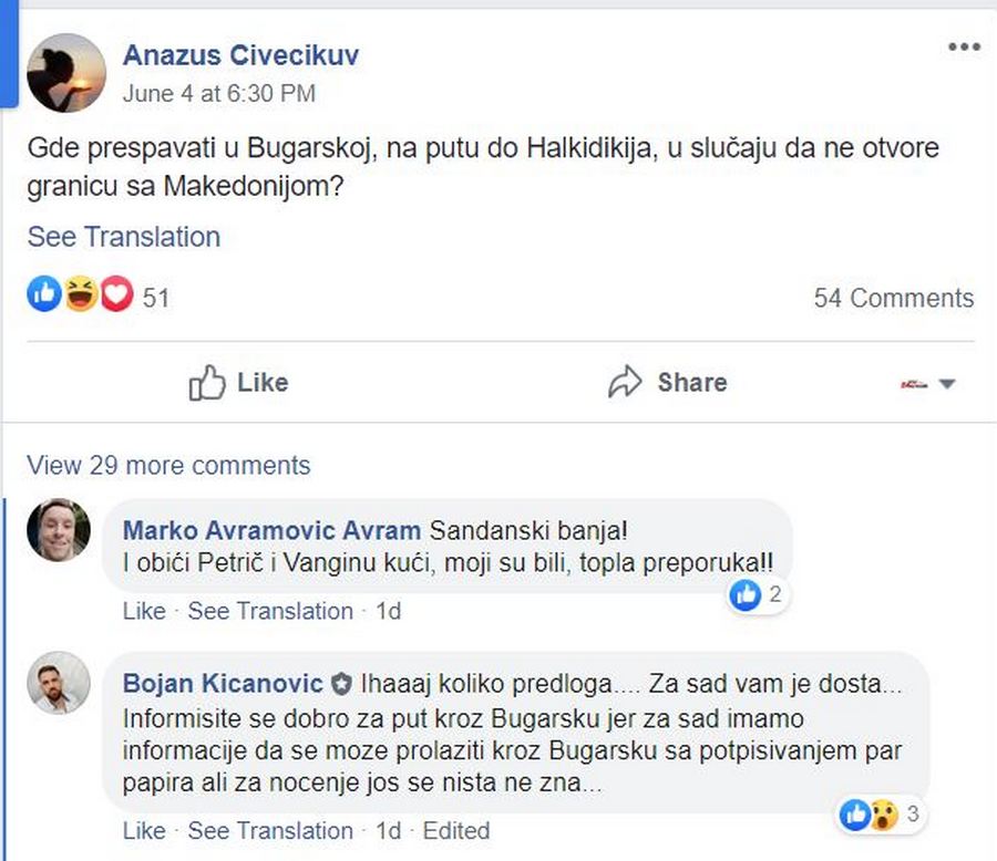 Се разменуваат информации каков е патот, каде има ресторани за одмор па дури и апартмани за преспивање. Доколку решат да возат од Србија до Грција преку Бугарија, српските туристи ќе имаа за околу 1,5 час подолг пат плус околу 40 км. повеќе за возење и околу 20 евра повеќе за бензин и патарини.