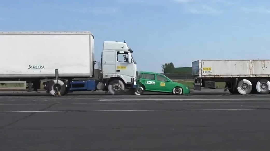 Се работи за симулација на несреќеа во која учествуваат два шлепери меѓу кои се наоѓа автомобил.